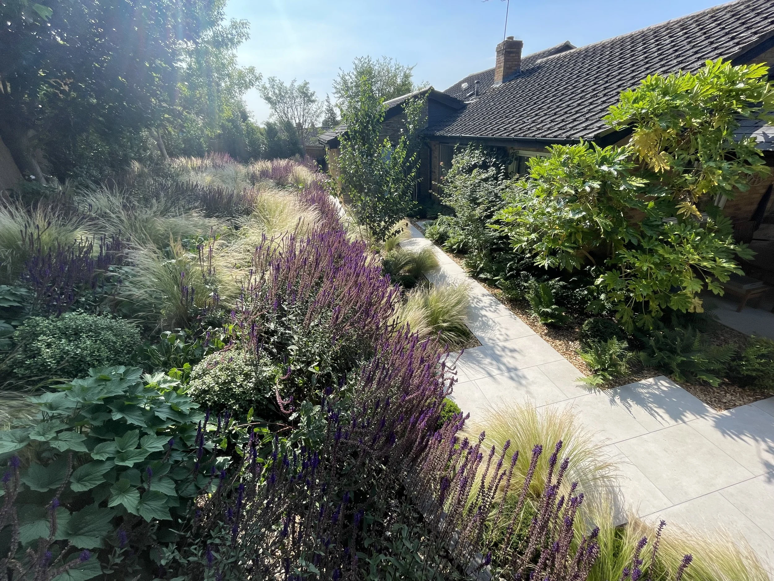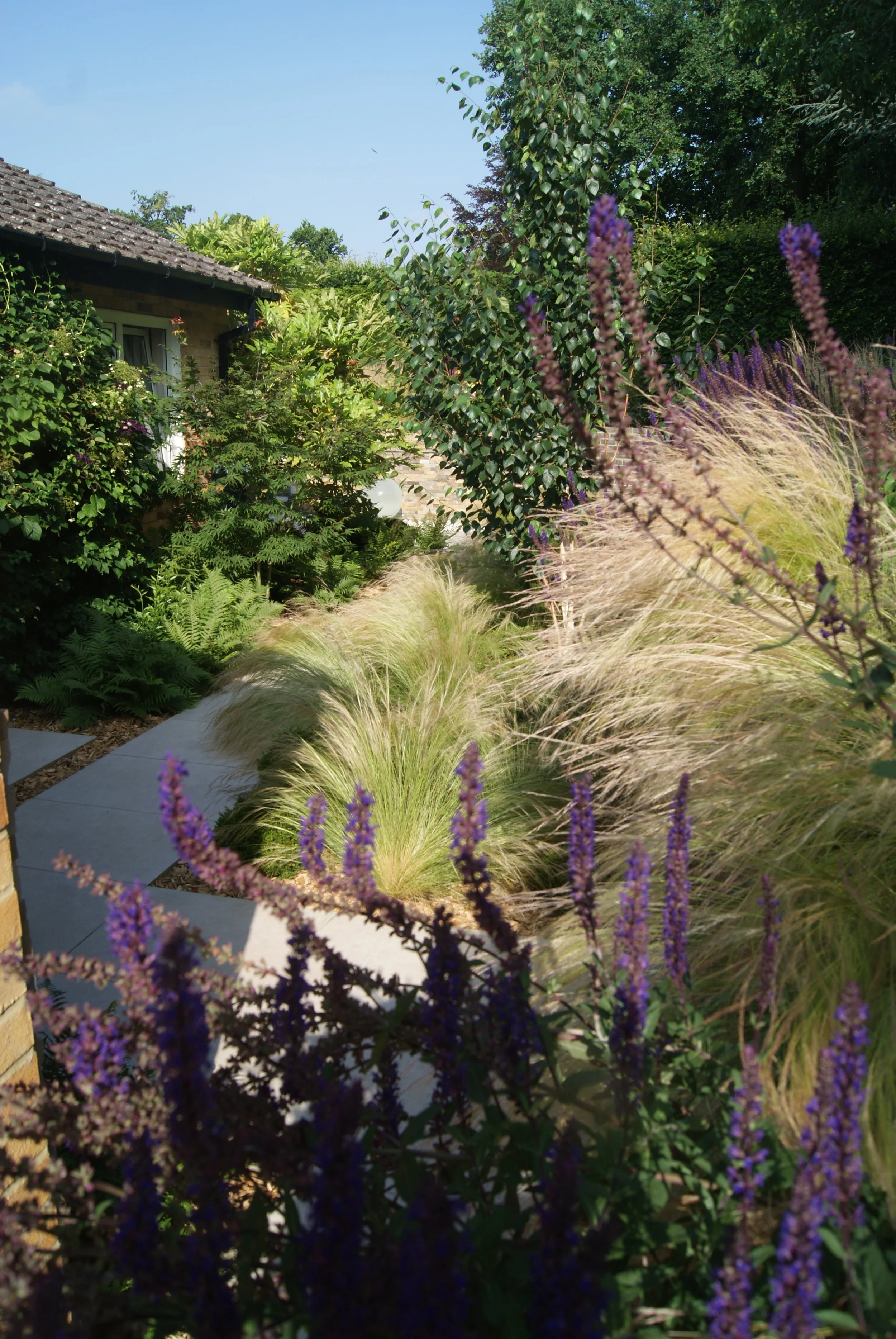The difficult to cut and awkward to access lawn was completely replaced in this garden with a bold swathe of prairie style planting that tumbles over the new retaining wall. On the lower level, a sleek and stylish path connects the two paved terraces positioned for morning and evening sun. Birch trees, ferns and evergreens are planted around the house to give a woodland edge feel to these shadier areas.